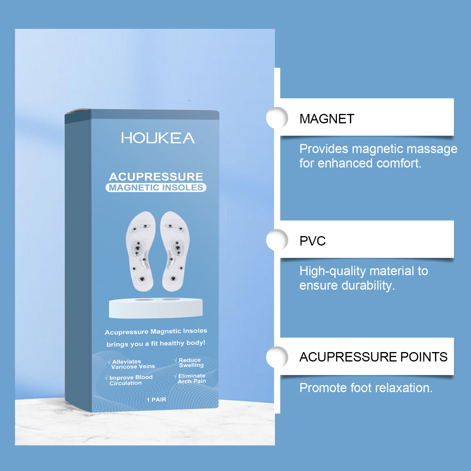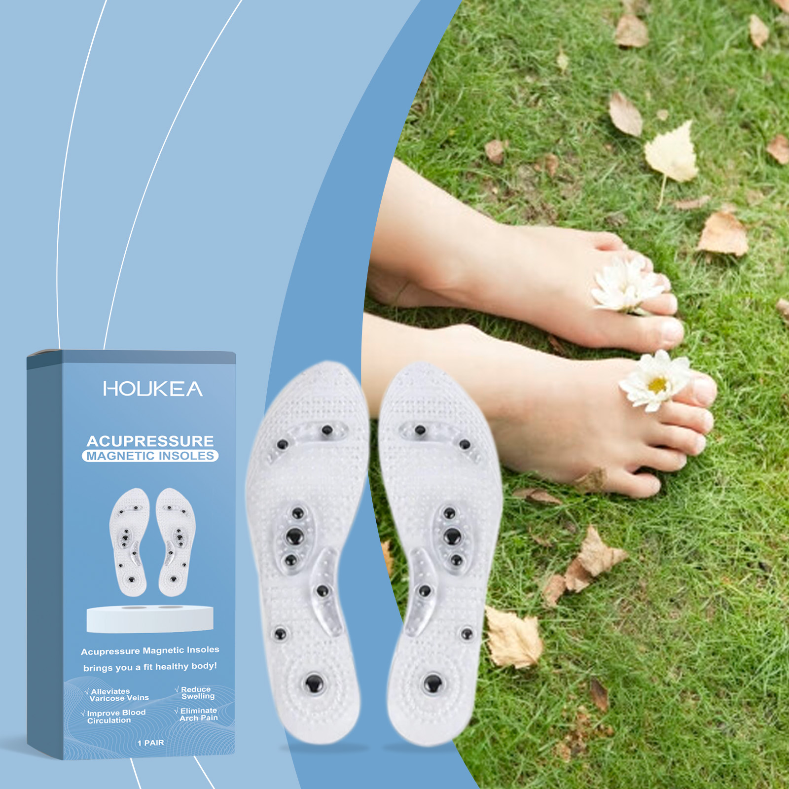 Our foot pressure insole contains magnet 10%,PVC 90%. It can provide magnetic massage for enhanced comfort. High quality material to ensure durability; Promotes foot relaxation. Its use is very simple: put the insole into the shoe and wear the shoe normally for daily activities. Scientific design, in line with the curve of the foot, improve comfort. High quality Pvc. Durable, long-term use worry-free.