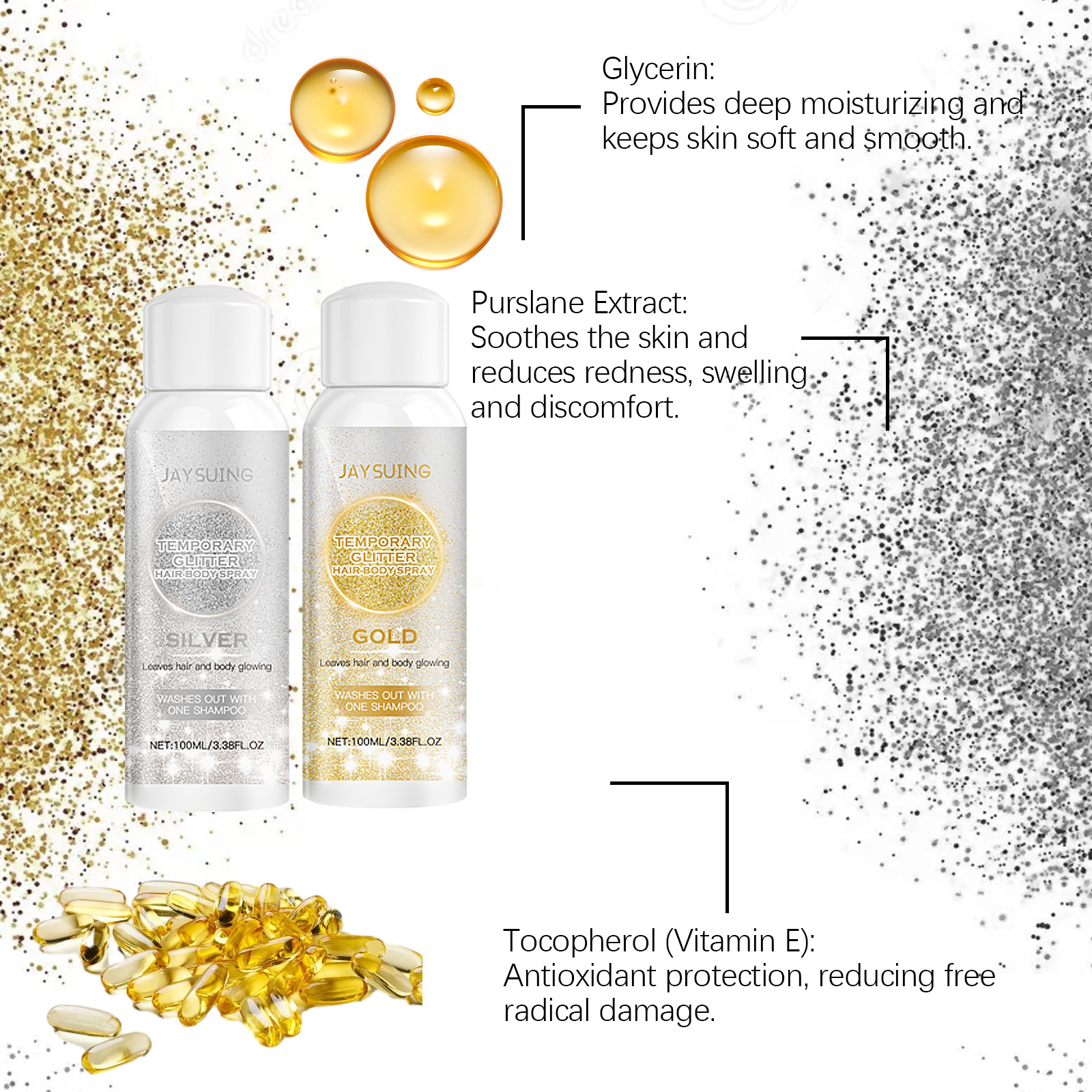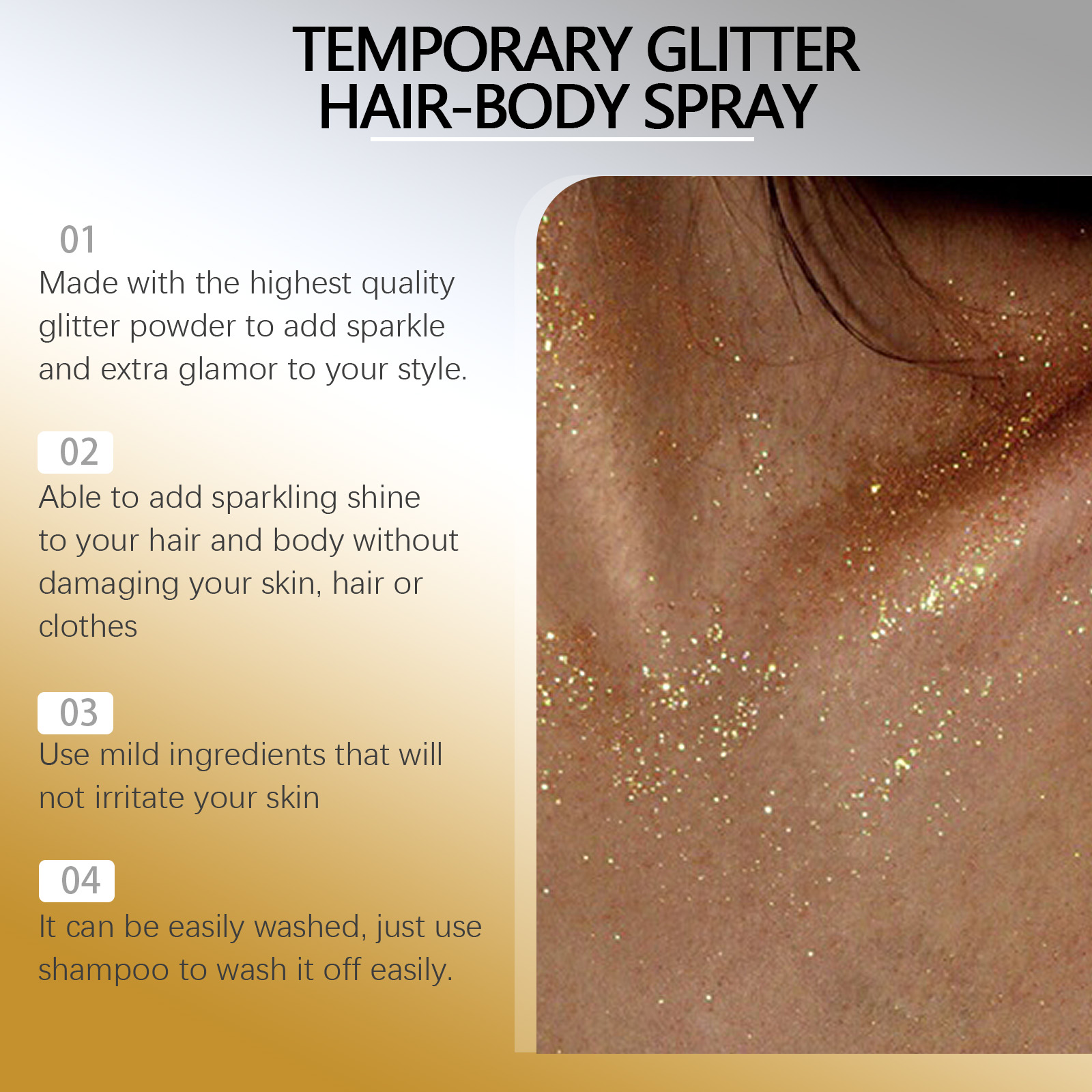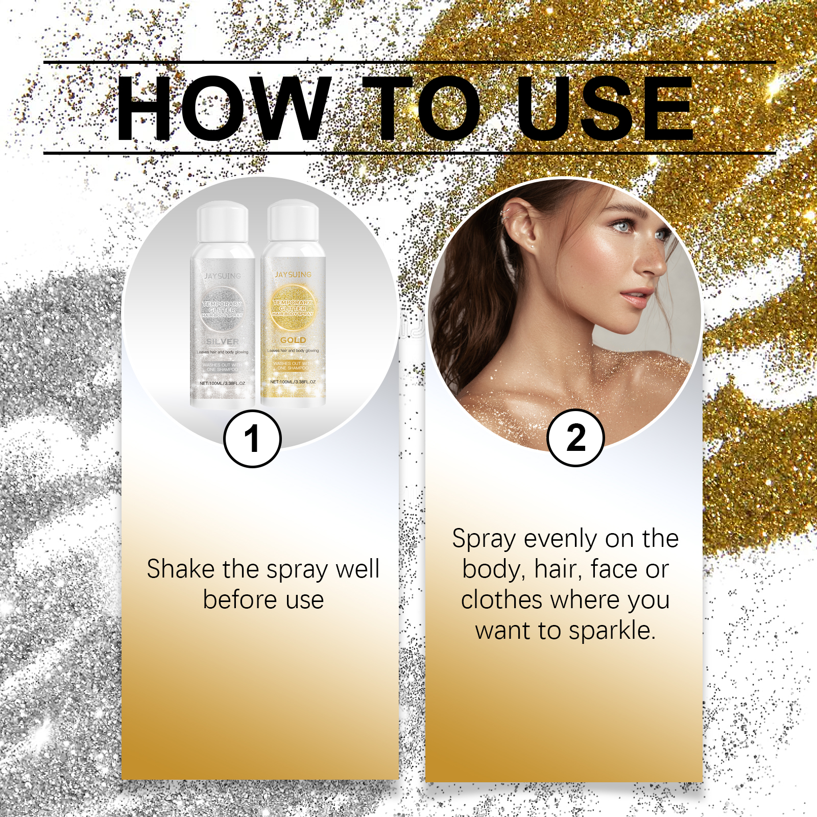 Our range of gold and silver glitter sprays contain glycerin and mineral oil. It can suit all skin tones and provide a glowing effect. Contains moisturizing ingredients to moisturize skin and prevent dryness. Its use method is very simple: 1. Shake the spray well before use; 2 Spray evenly on your body, hair, face, or clothing where you want to shine. Easy to spray design, evenly cover the whole body, easily create a perfect makeup effect. Suitable for all parts of the body, including shoulders, arms and legs.
