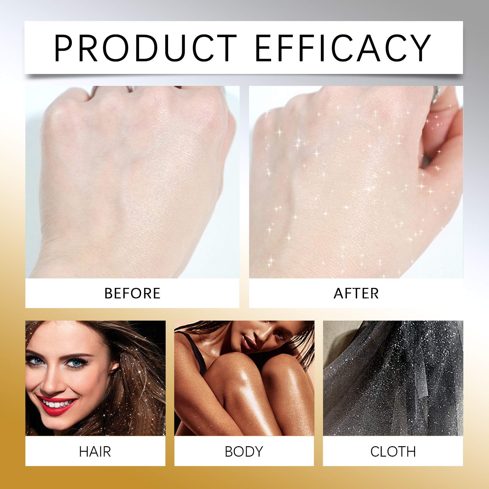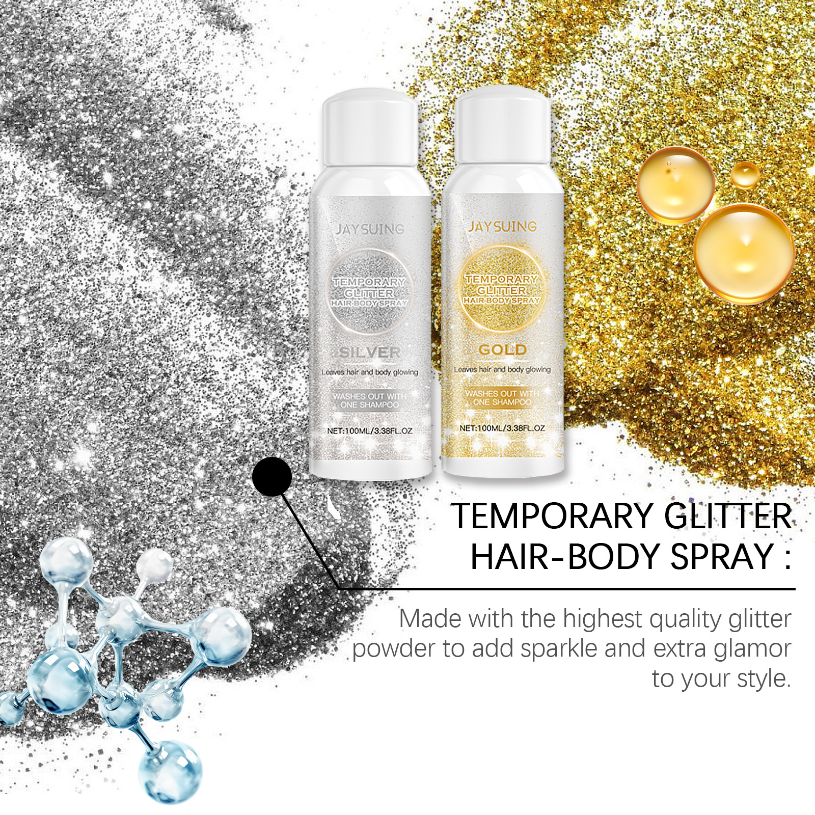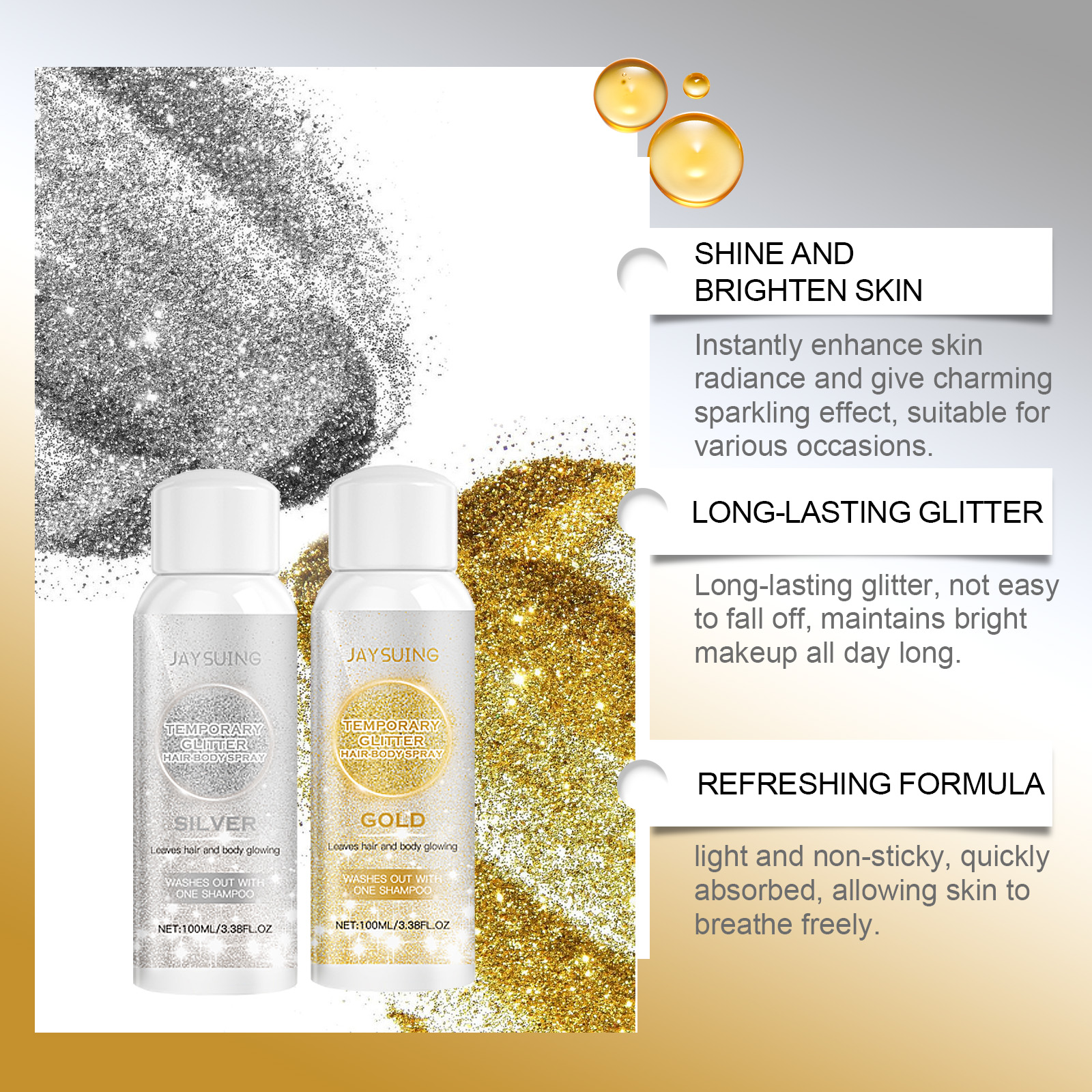 Our range of gold and silver glitter sprays contain glycerin and mineral oil. It can suit all skin tones and provide a glowing effect. Contains moisturizing ingredients to moisturize skin and prevent dryness. Its use method is very simple: 1. Shake the spray well before use; 2 Spray evenly on your body, hair, face, or clothing where you want to shine. Easy to spray design, evenly cover the whole body, easily create a perfect makeup effect. Suitable for all parts of the body, including shoulders, arms and legs.