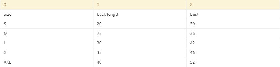Size: S back length 20 (recommended 2-3 jin),M back length 25 (recommended 4-5 jin),L back length 30 (recommended 6-8 jin),XL back length 35 (recommended 9-11 Jin),XXL back length 40 recommended 12-18 Jin