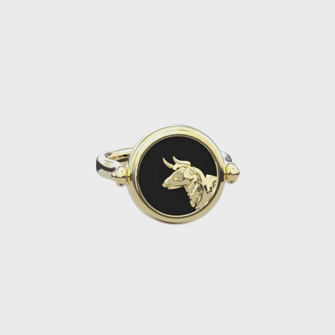 A twin-faced signet crafted in gold and black onyx—choose a zodiac symbol for the front and a personal initial for the back. Wear it as a bold ring or attach it to a chain as a pendant. Two sides. Two ways. One story.